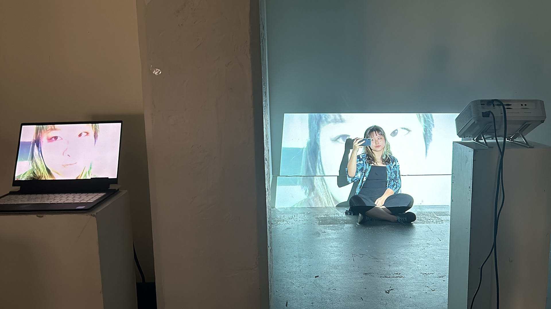 In the performance, I sit against a wall, holding my phone, repeatedly making the gesture of checking my appearance through the phone camera. The phone screen is projected in real-time onto myself while also being displayed on a laptop screen set on a pedestal a few meters away around the corner. As the projections reflect infinitely, with a lagging effect due to real-time signal transmission, each of my actions is repeated multiple times by the projection. A monologue plays in the background, read by multiple voices and gradually edited to become more chaotic and fragmented, reflecting on the fragmented self shaped by the external digital gaze and expressing a desire to see oneself through the eyes of an abstract online presence.