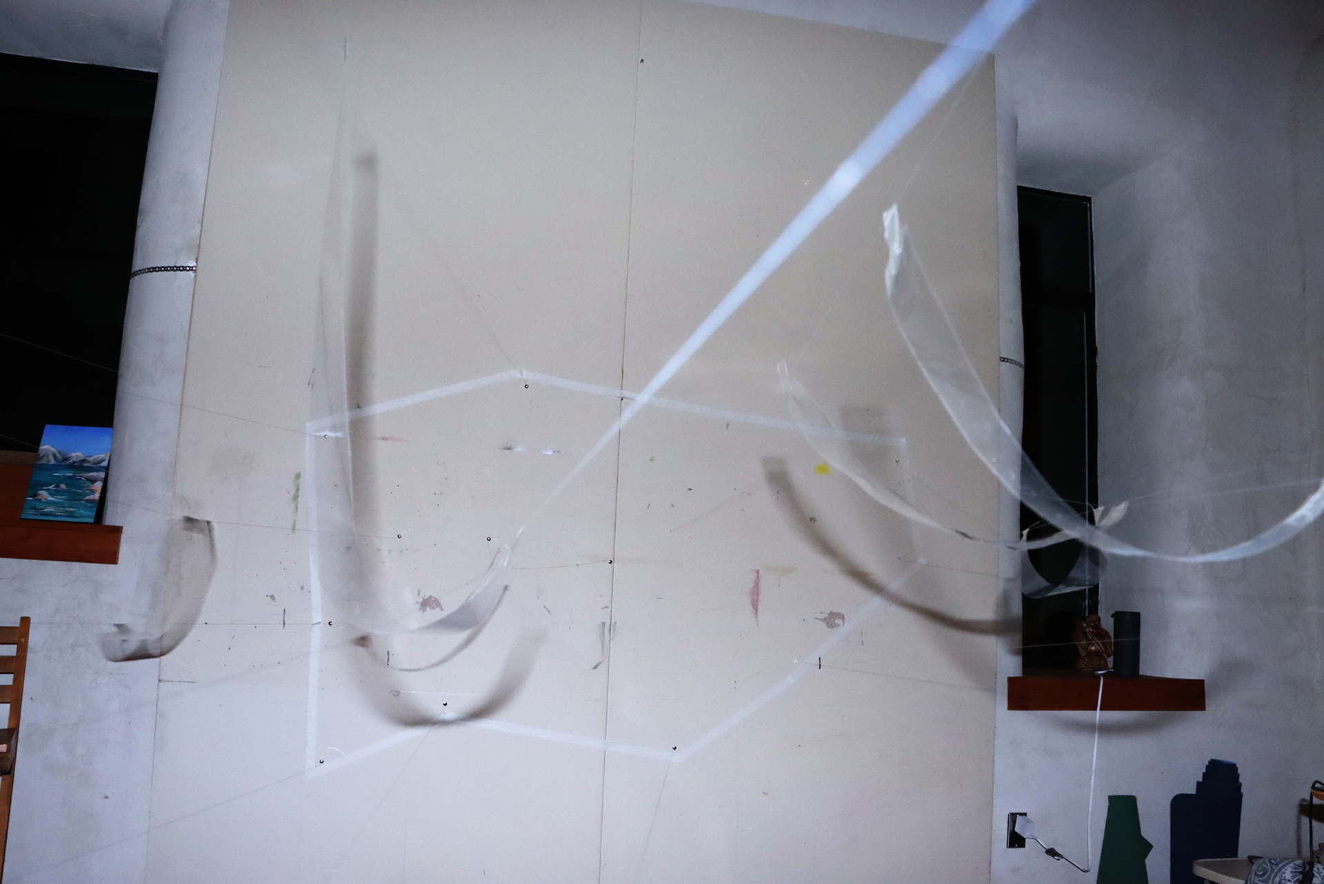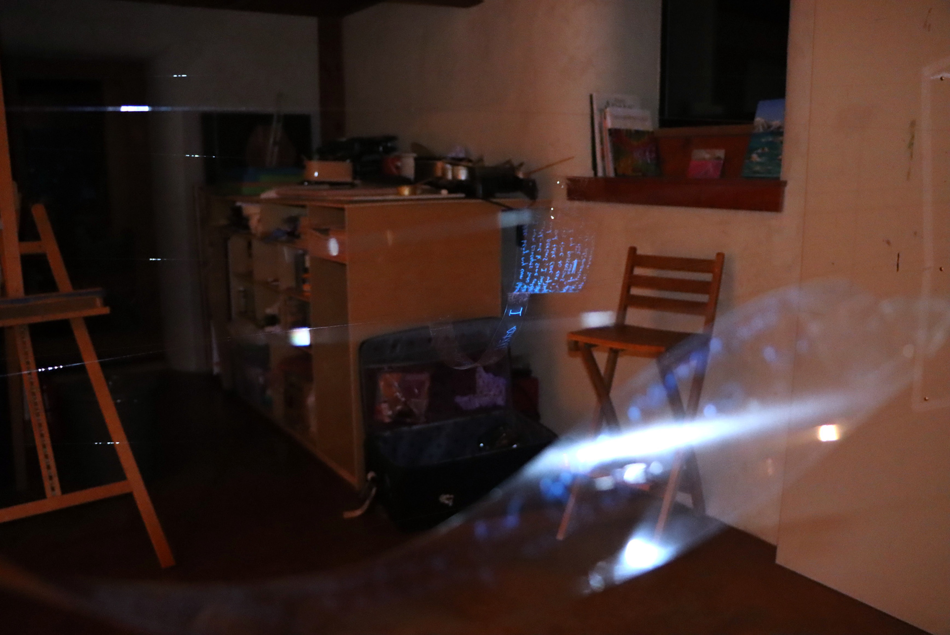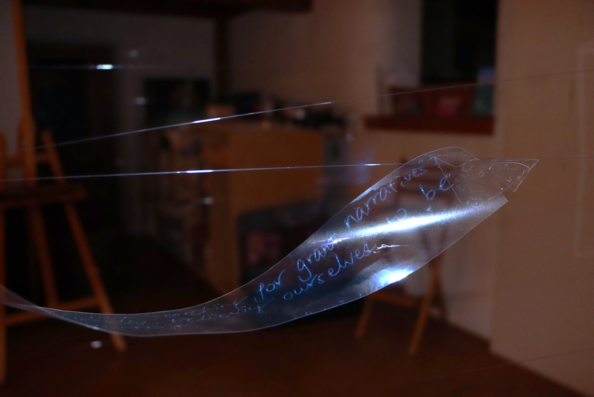 This work consists of plastic sheets with phrases and sentences written in UV ink, suspended by fishing lines across the studio where I completed my residency in Nelson, Canada. The text is drawn from the thoughts I recorded in the moment as I strung these fishing lines between the studio walls. This choice ties this work closely to my time and experience in that studio—it's a physical manifestation of the ideas that occurred to me in the space and returned to it in an analogous form to become part of the space.