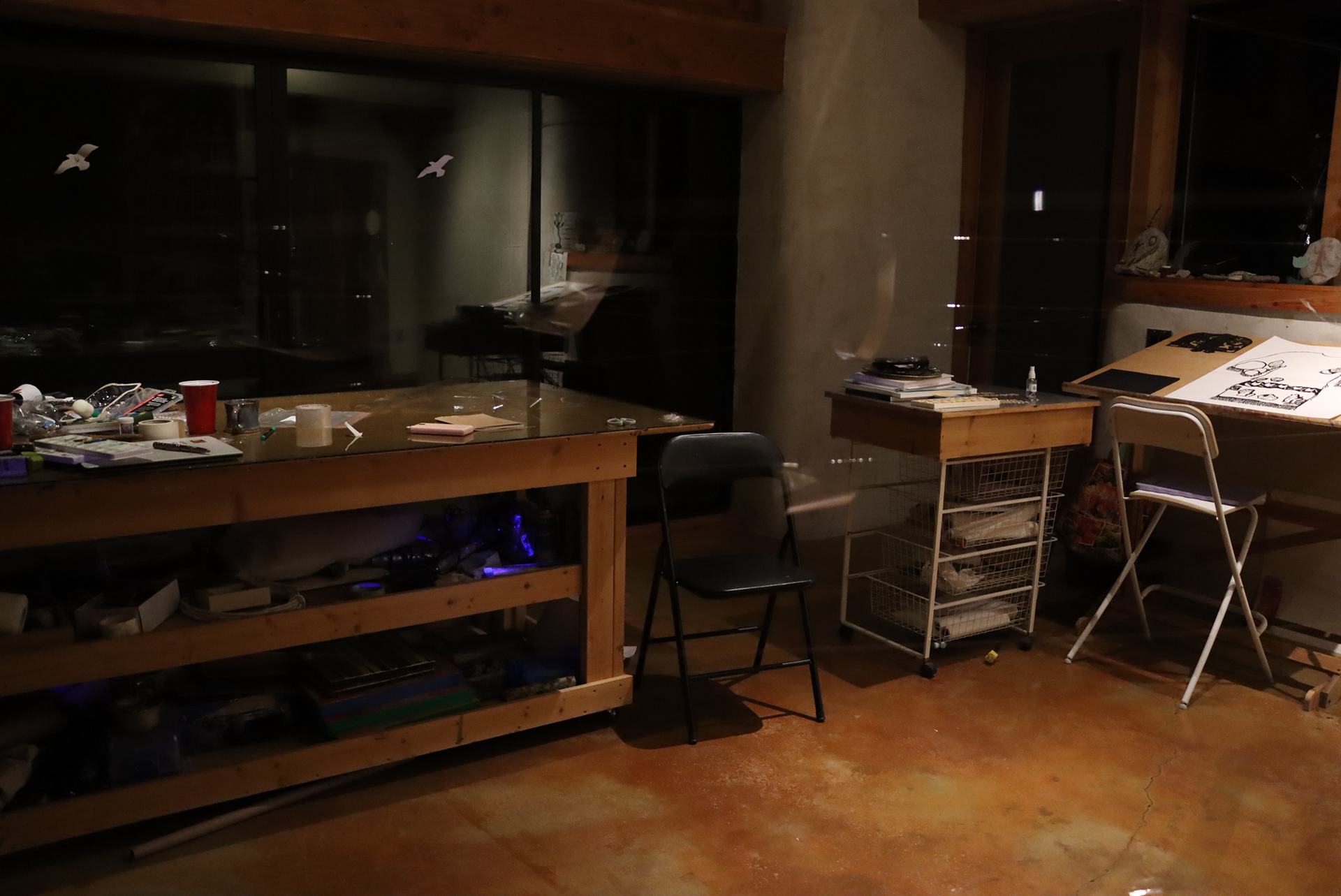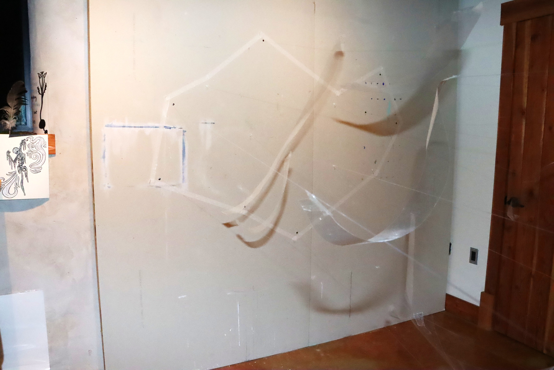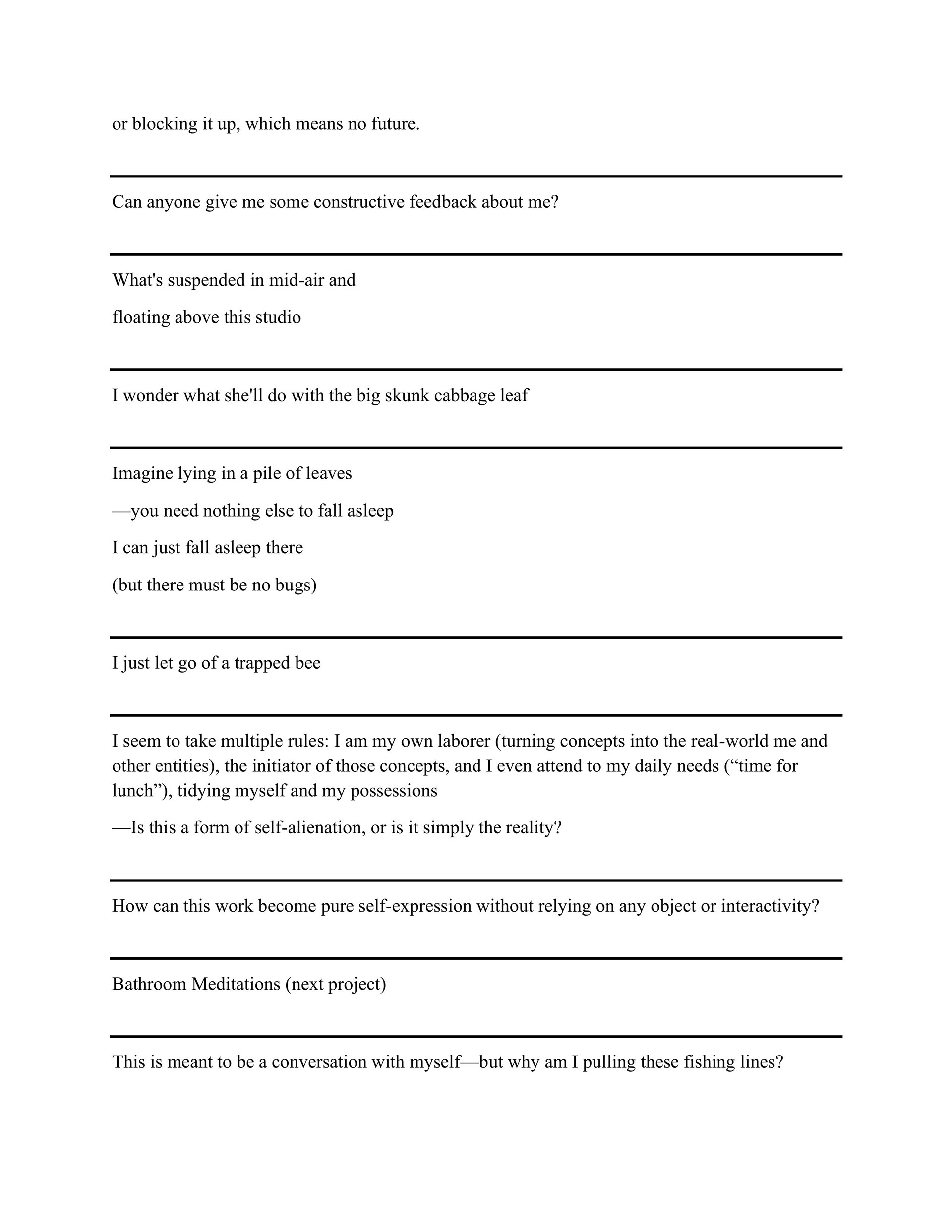 This work consists of plastic sheets with phrases and sentences written in UV ink, suspended by fishing lines across the studio where I completed my residency in Nelson, Canada. The text is drawn from the thoughts I recorded in the moment as I strung these fishing lines between the studio walls. This choice ties this work closely to my time and experience in that studio—it's a physical manifestation of the ideas that occurred to me in the space and returned to it in an analogous form to become part of the space.