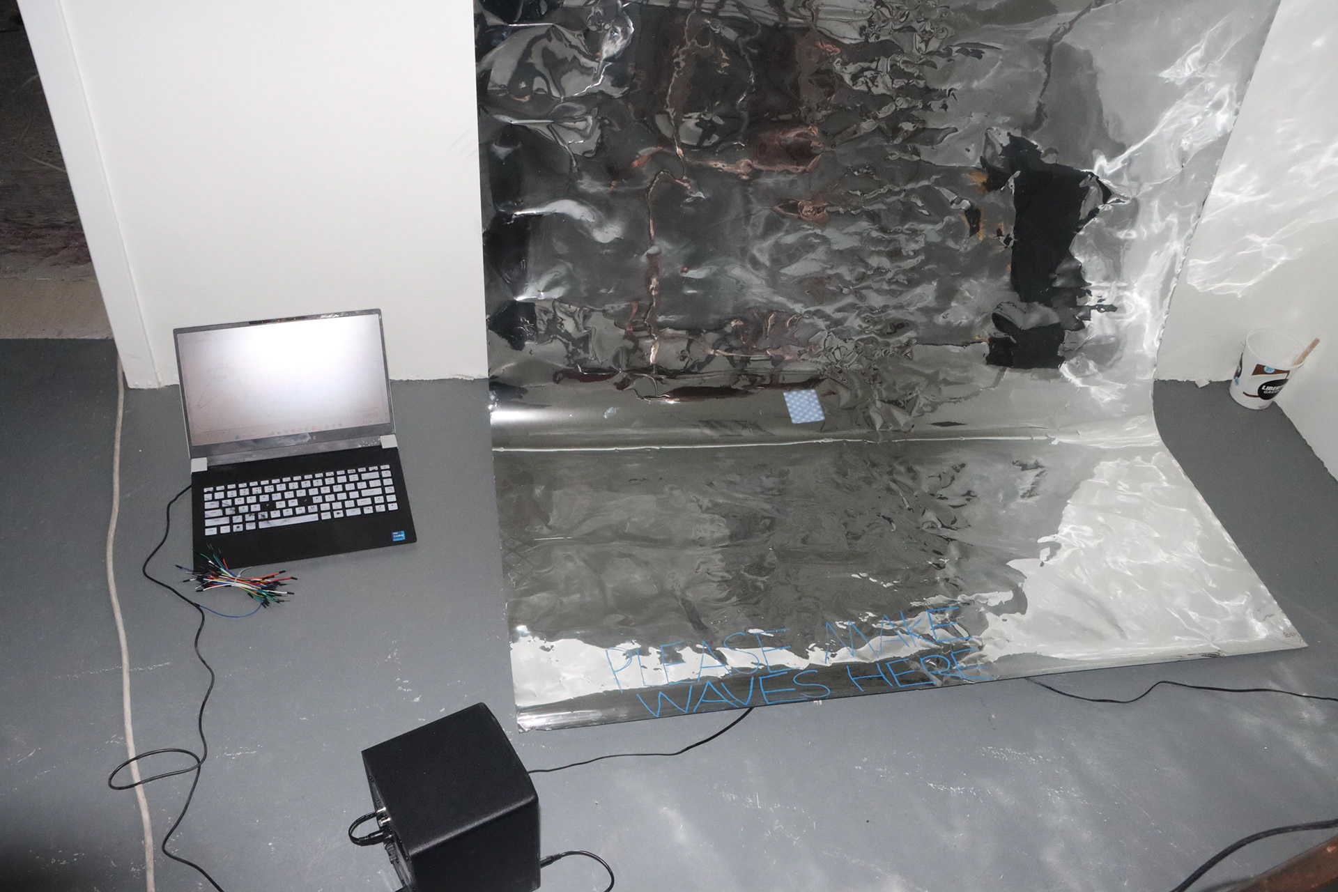In the case of waves, these senses include auditory, tactile, and visual perception. The audio is played through the two speakers in a randomized back-and-forth pattern, creating an immersive experience that simulates the sensation of an imaginary entity moving between the speakers and emitting sounds. The tactile component consists of an amplifier, transducer, and instructions prompting viewers to place the device against their chest, allowing them to feel the vibrations of the same audio track. This setup recalls the common experience of physically interacting with waves, while reflections of water-like patterns appear on the walls in response to the movements. The visual side has a piece of mylar material with an instruction written on it and asking the viewers to manually make waves by shaking the mylar piece. This would recall the common experience of interacting with waves physically while reflections of water-like patterns appear on the walls as movements were made.